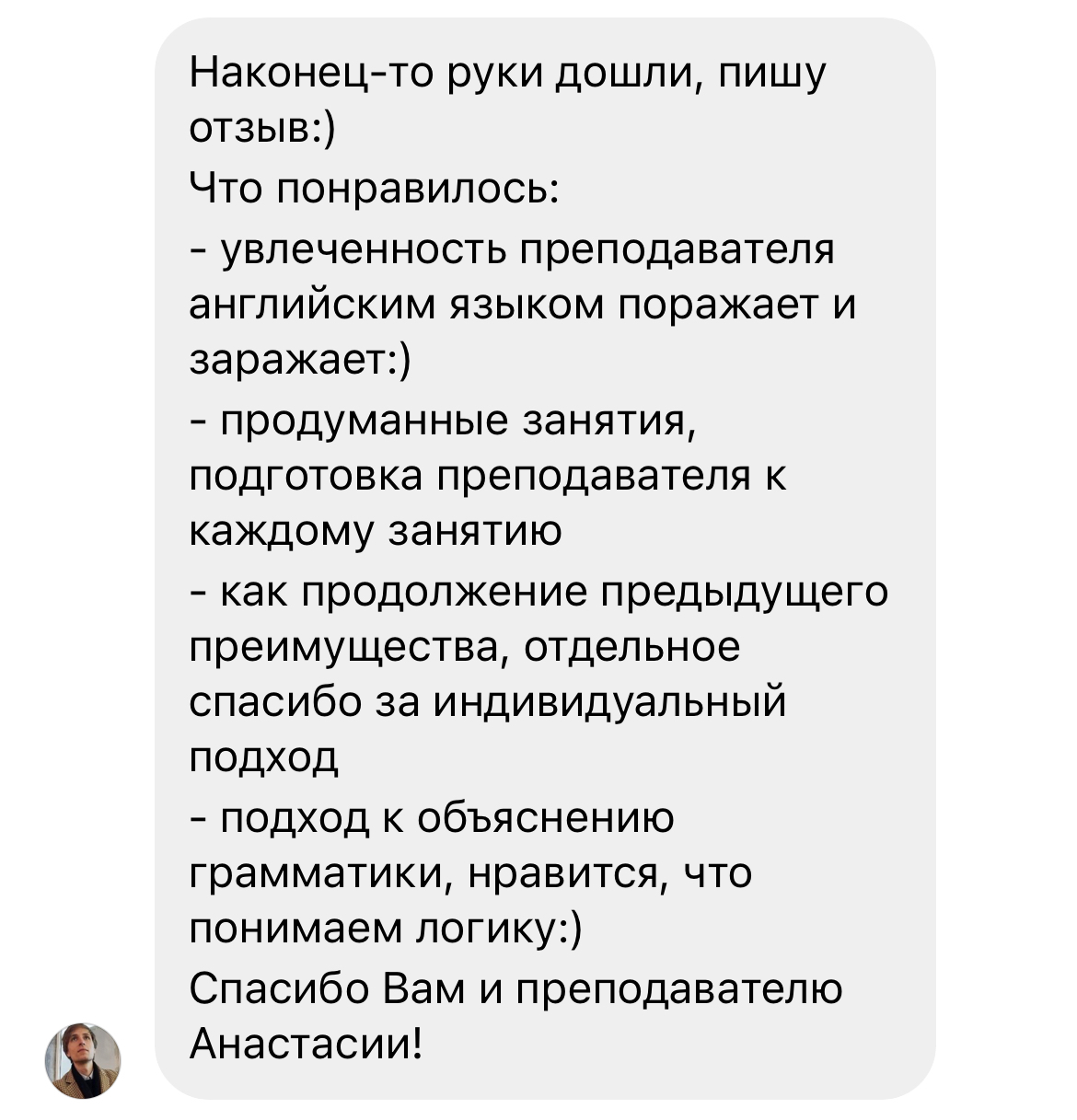 Мягко, но уверенно сломает твой языковой барьер. Разбирается в сленге и современной лексике, любит юмор на английском и много путешествует. На ее уроках приятная атмосфера сочетается с продуктивной работой.